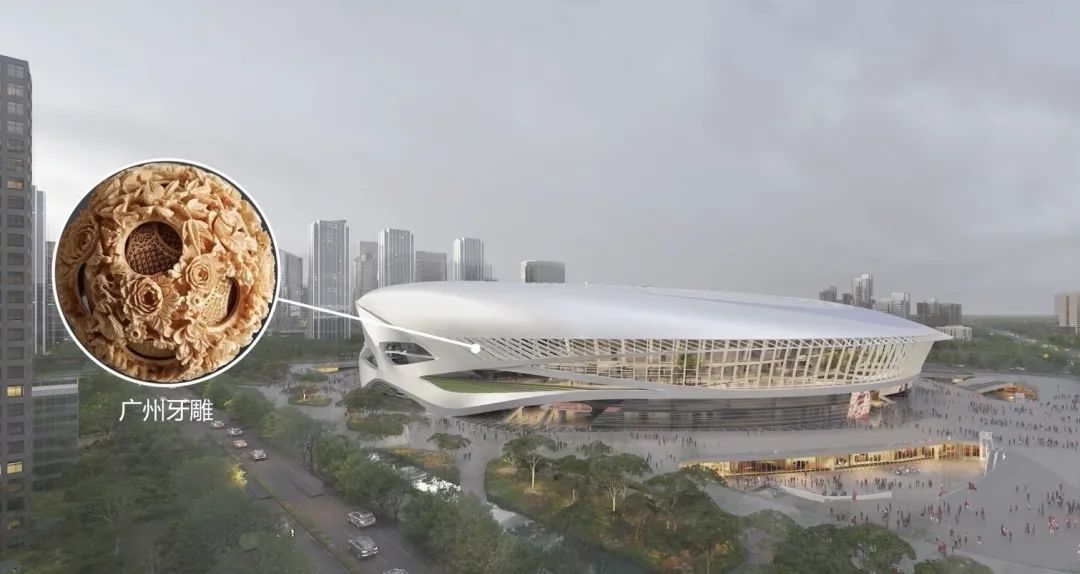 在设计理念上,广州足球公园球场项目融合了深厚的文化底蕴。建筑设计负责人安康介绍,项目以“瑞玉吉祥·生态玲珑”为设计理念,灵感来源于南越王墓出土的“透雕龙凤纹重环玉佩”,以及传承两千多年的国家级非物质文化遗产“广州牙雕”。