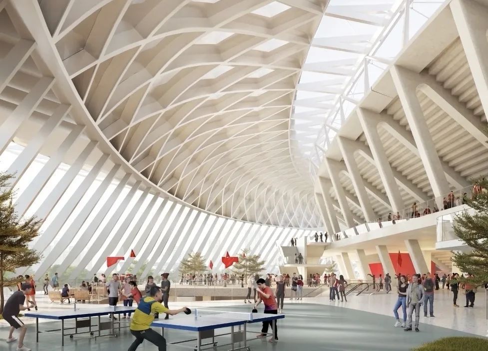 建筑外观光滑洁白,质感温润如玉,建筑造型与空间层层相叠、回转流动,传递牙雕玲珑剔透的形态,建筑正面像一顶隐含冠军寓意的桂冠,传达砥砺奋进的竞技精神与优胜形象。